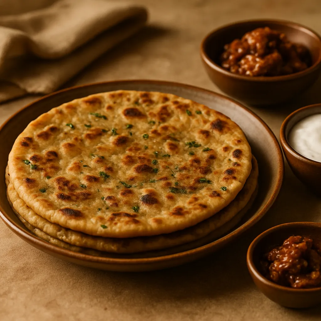 A stuffed flatbread made with spiced mashed potatoes, served with yogurt and tangy pickle.
