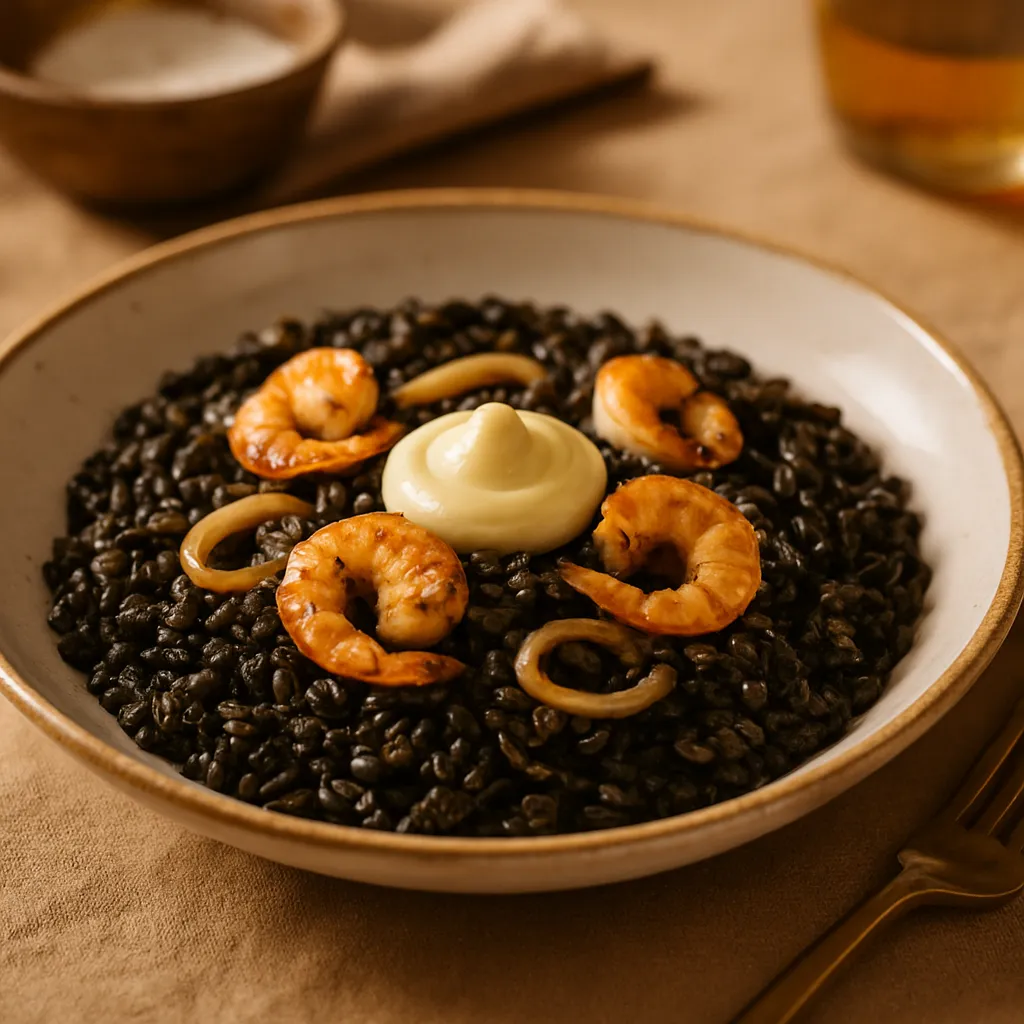 A striking black rice dish made with squid ink, seafood, and served with alioli.