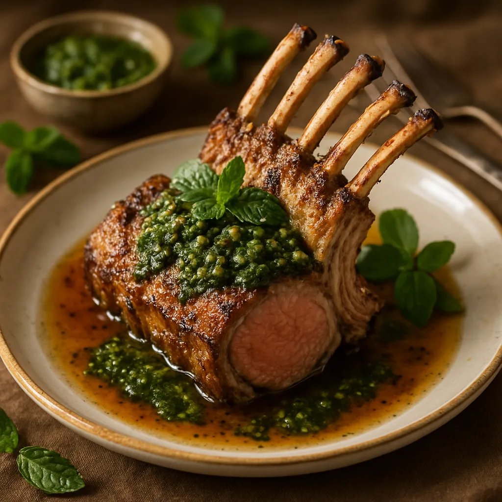 Slice the rack of lamb into individual chops and serve with the mint sauce drizzled on top.