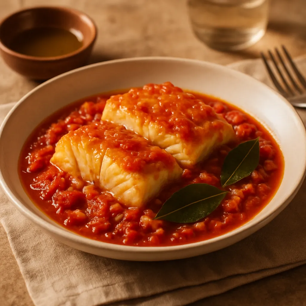 Salt cod stewed in a rich tomato and pepper sauce, a traditional Basque dish full of flavor.