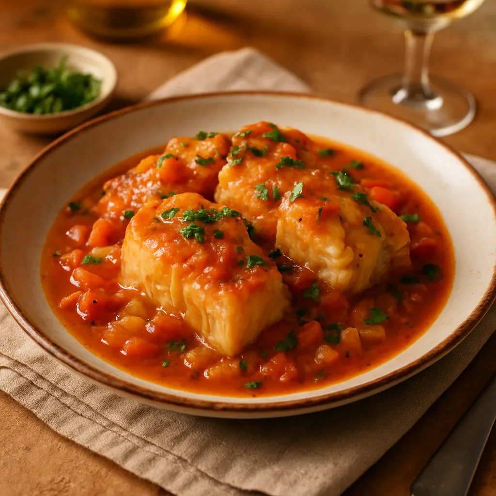 A traditional dish from Vicenza featuring salted cod cooked slowly with onions, tomatoes, and olive oil, perfect for a hearty Italian dinner.