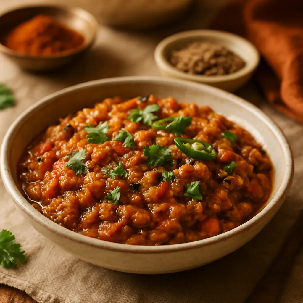 Roasted and mashed eggplant cooked with spices, onions, and tomatoes, a traditional Punjabi dish.