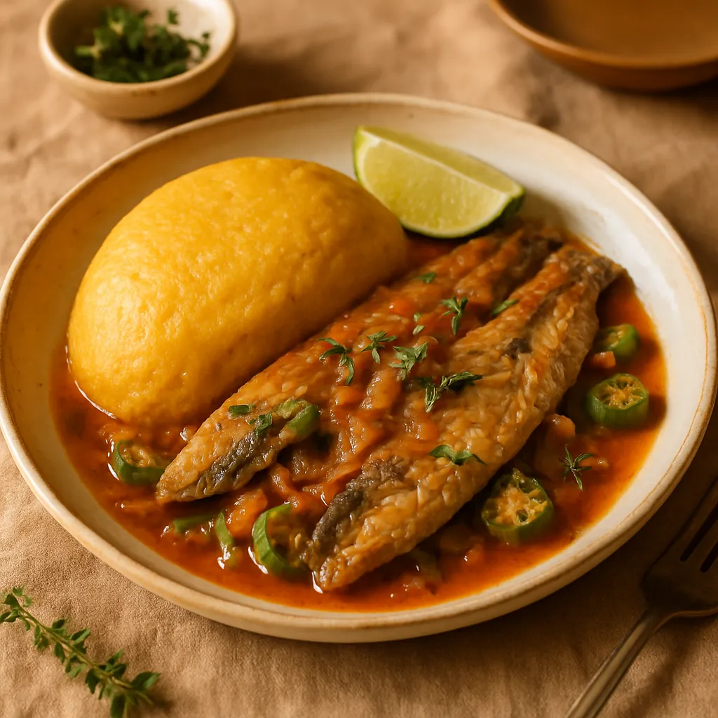 Traditional Bajan dish featuring seasoned flying fish served with creamy cornmeal cou-cou, perfect for a flavorful lunch.