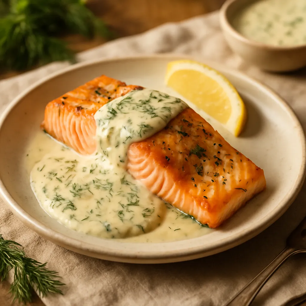 Pour the creamy dill sauce over the salmon fillets, ensuring they are well coated.