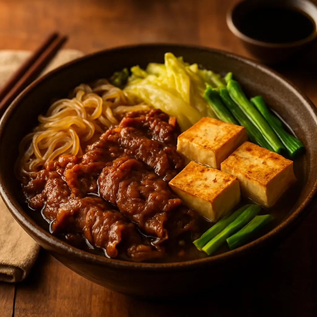 A one-pot dish of thinly sliced beef, vegetables, and tofu simmered in a sweet soy sauce broth, perfect for a cozy dinner.