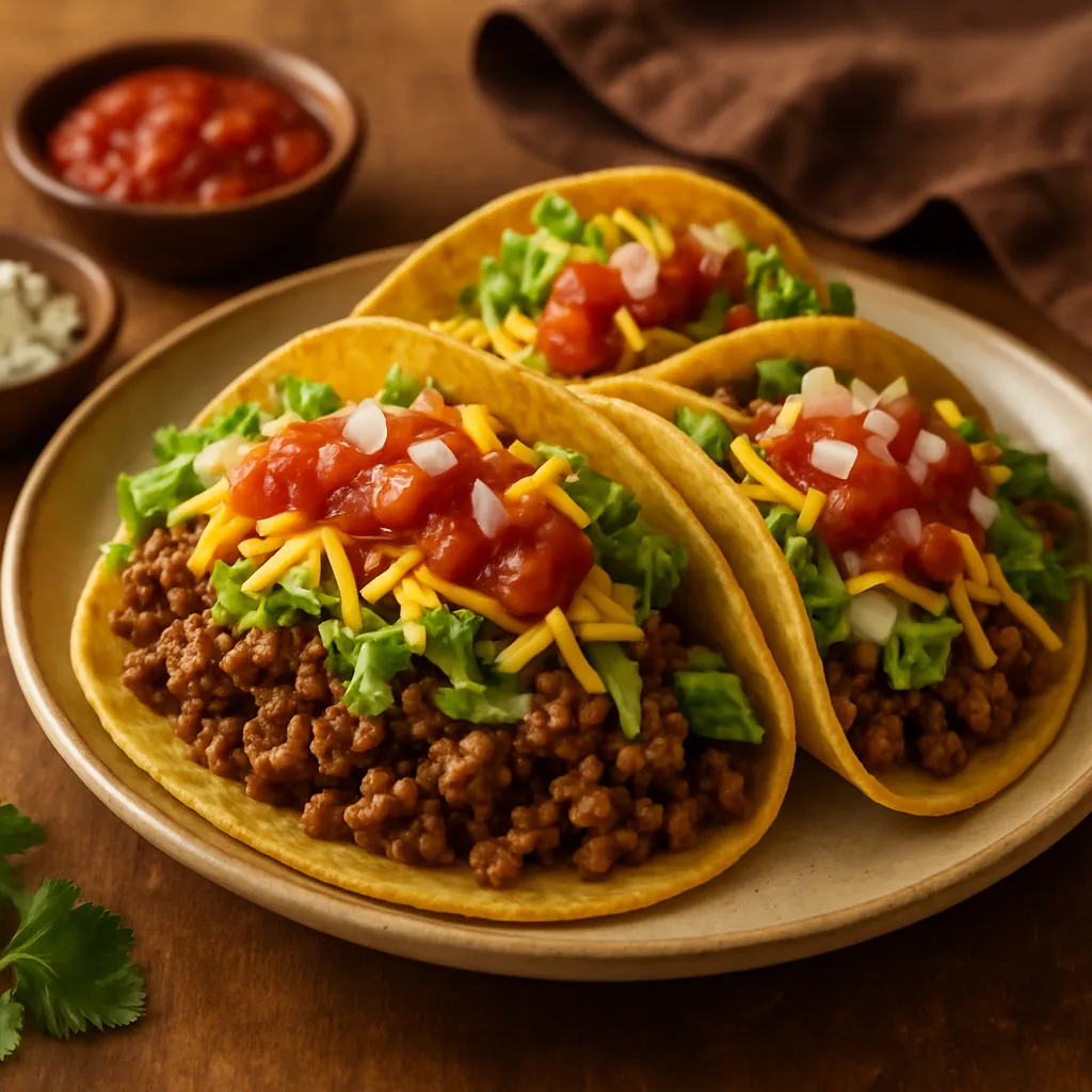 Soft corn tortillas filled with seasoned ground beef, lettuce, cheese, and salsa for a classic taco night.