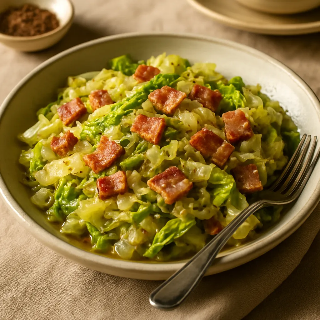 Tender cabbage braised with smoky bacon, a flavorful side dish or light lunch option.