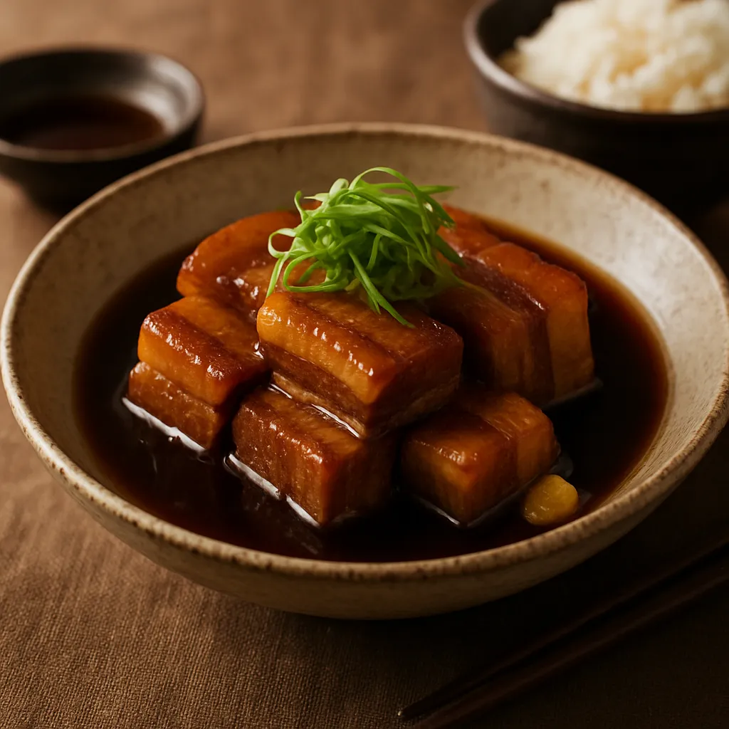 Rich and savory braised pork belly cooked in a soy sauce and sugar mixture until tender, perfect for a Japanese-inspired dinner.