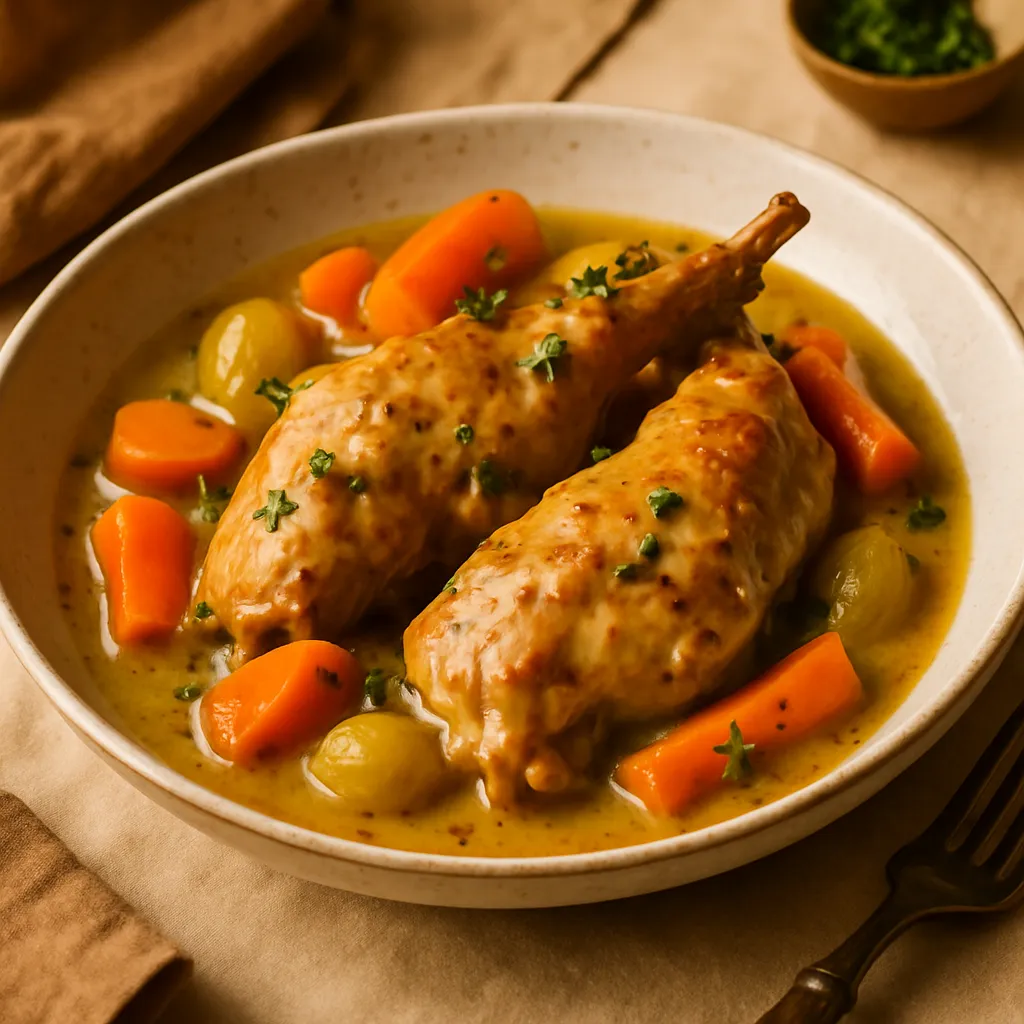 Tender rabbit braised with vegetables and served in a rich mustard sauce, a traditional Irish dish.