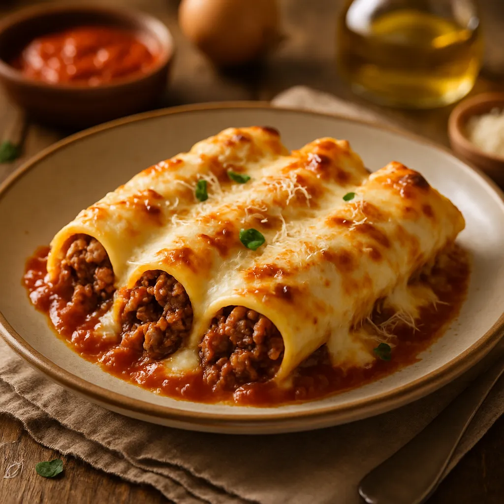 Pasta tubes filled with a savory meat mixture, baked in a rich tomato sauce.