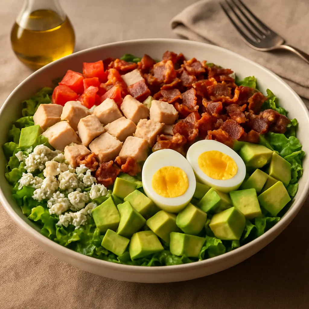 This hearty Cobb salad is a colorful mix of greens, chicken, bacon, and eggs, making it a nutritious American lunch option.