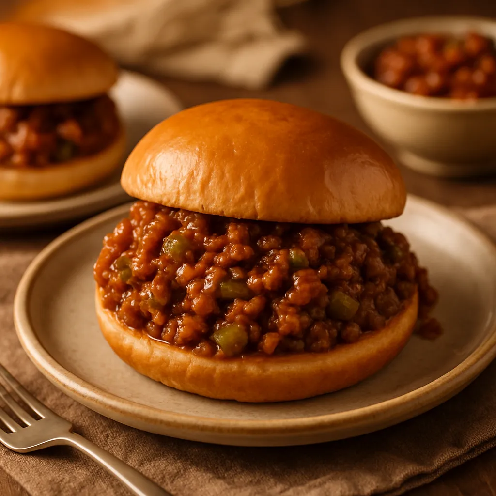 Enjoy the classic taste of American Sloppy Joes, a hearty and flavorful mix of ground beef and spices served on soft buns, perfect for a quick snack or dinner.
