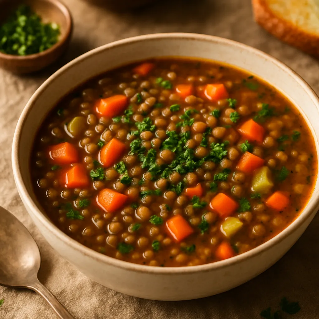 A nutritious soup made with lentils and vegetables, perfect for a filling meal any time.