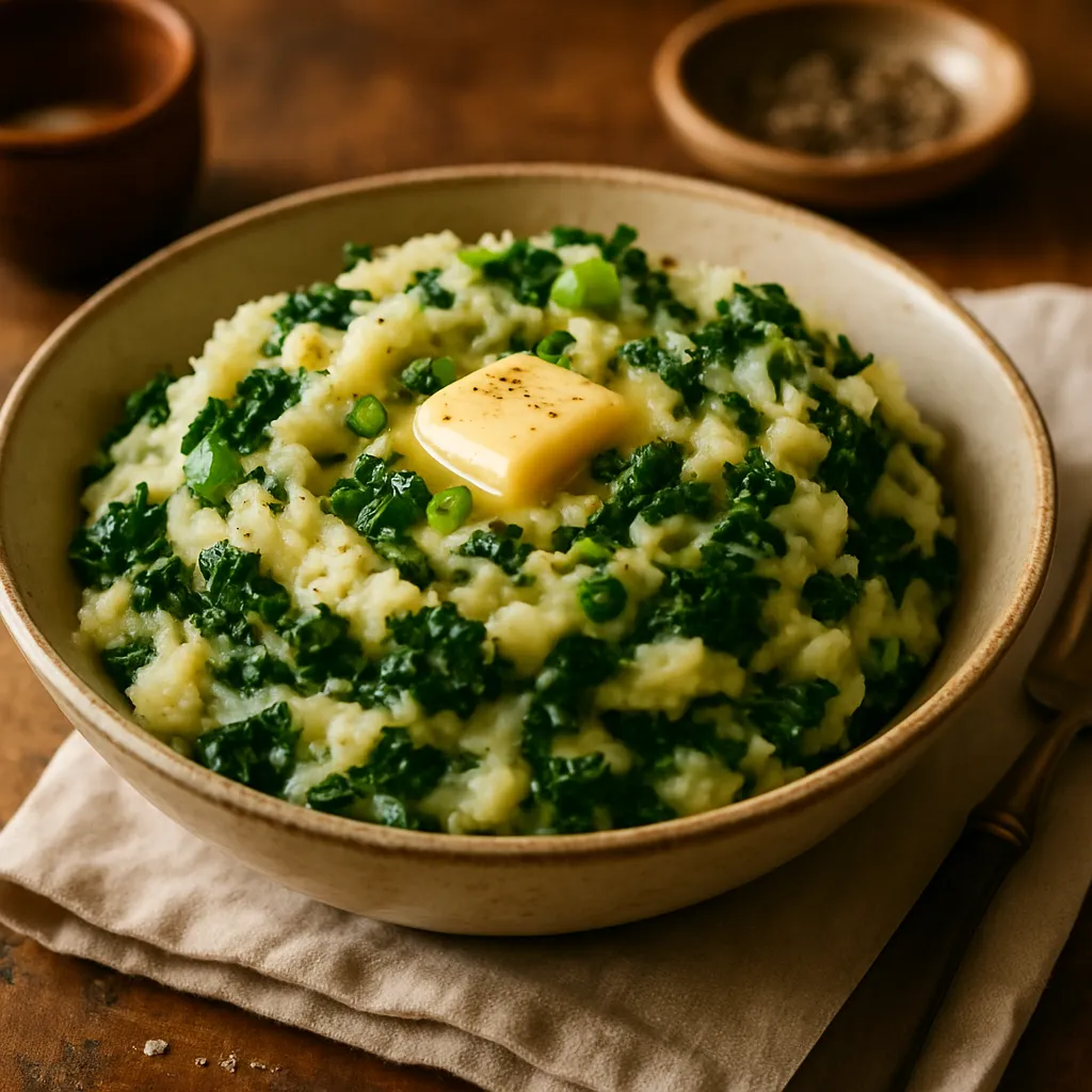 A comforting dish of mashed potatoes mixed with creamy kale and scallions, ideal for a rustic Irish lunch.