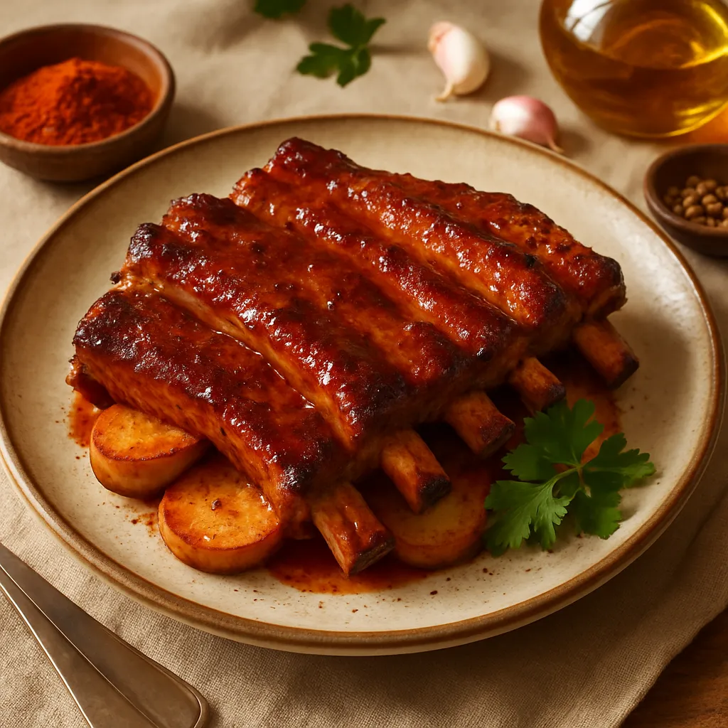 Juicy pork ribs marinated and grilled, served with a tangy barbecue sauce, popular in many regions.