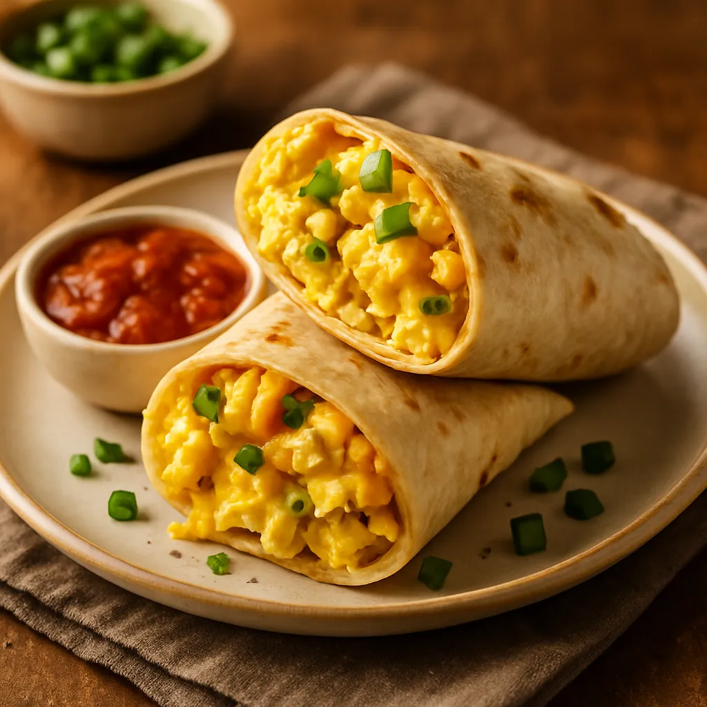 A quick and satisfying breakfast burrito filled with fluffy scrambled eggs and melty cheese, ideal for lunch.