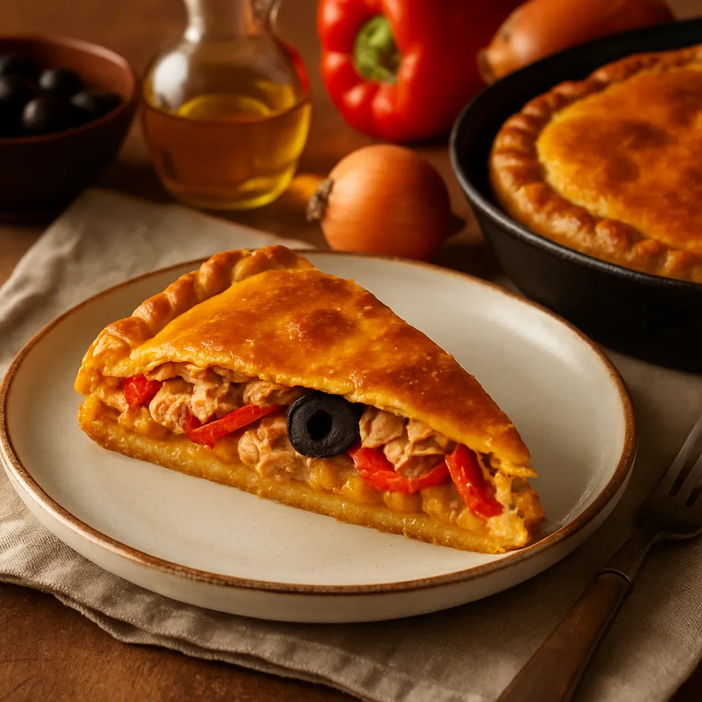 A savory pie from Galicia filled with tuna, peppers, and onions, perfect for a portable lunch.