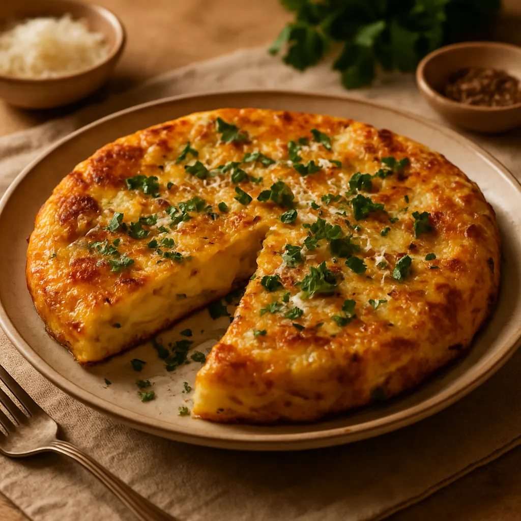 An Italian-style omelette made with potatoes, onions, and eggs, cooked until golden and fluffy.