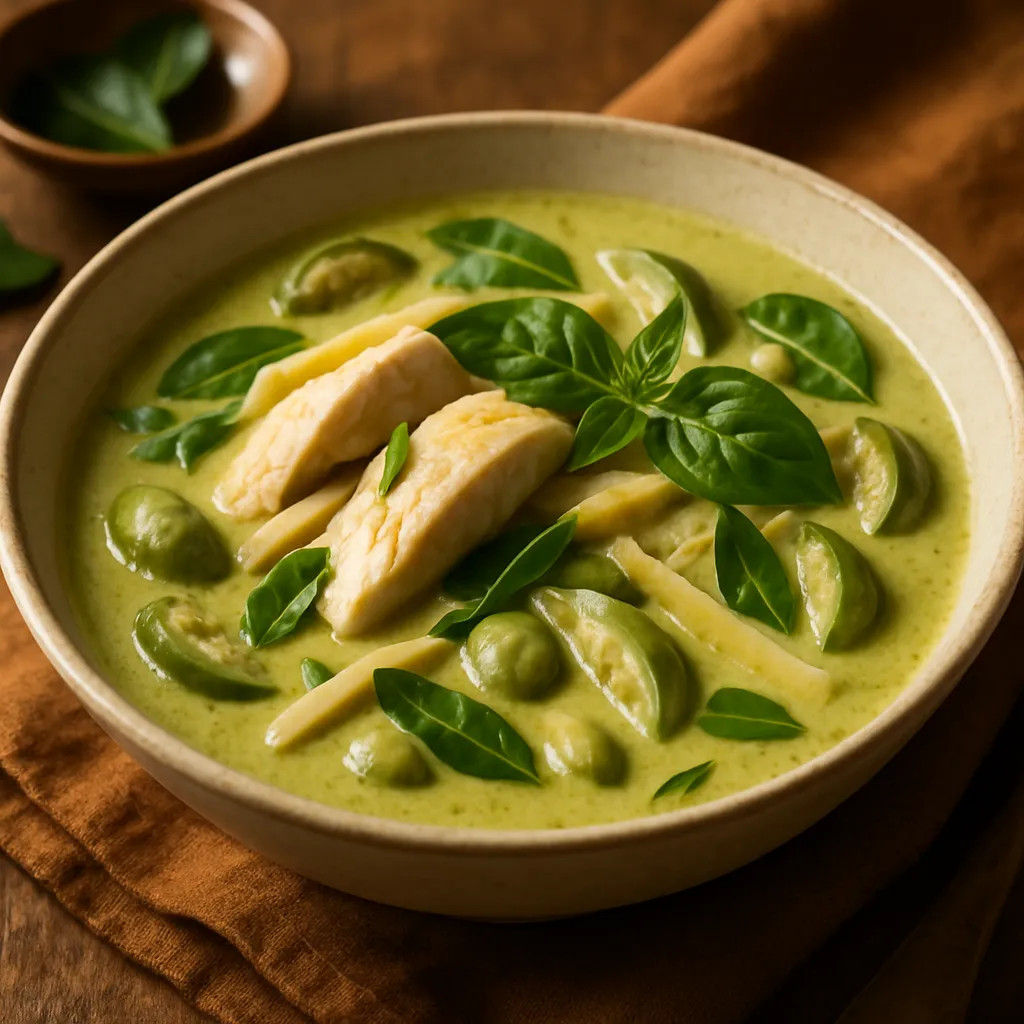 A vibrant and aromatic green curry soup with chicken, coconut milk, and fresh vegetables, bursting with flavor.