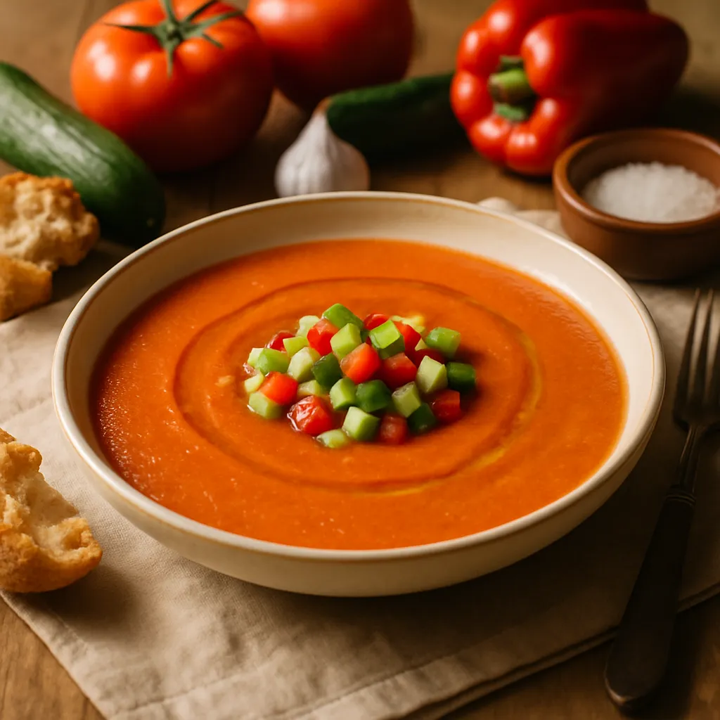 A refreshing cold soup made from ripe tomatoes, peppers, cucumbers, and garlic, ideal for hot days.