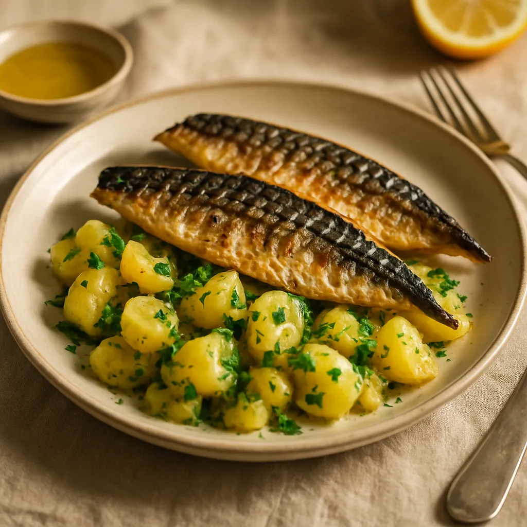 Fresh mackerel grilled to perfection, served alongside a vibrant potato salad with herbs and mustard dressing.