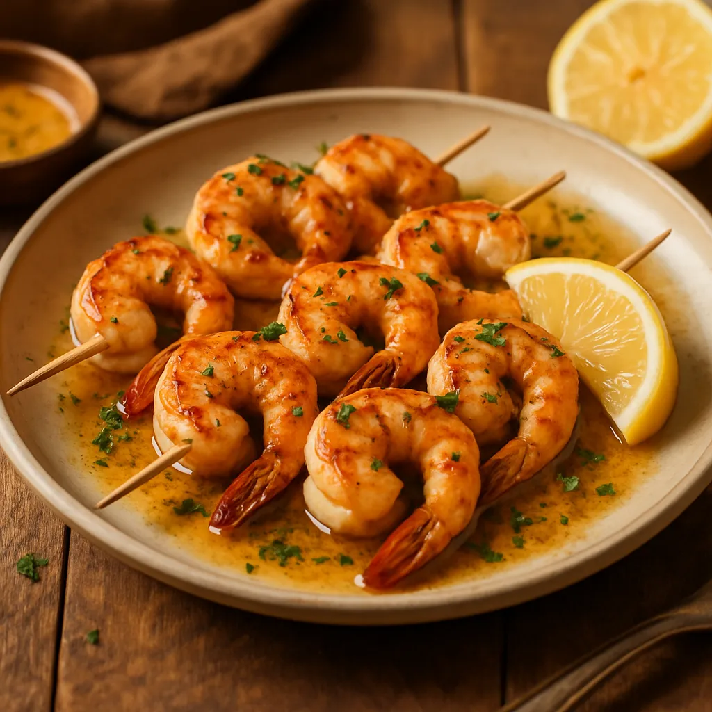 Juicy shrimp marinated in garlic butter and grilled on skewers for a quick and delicious barbecue dish.