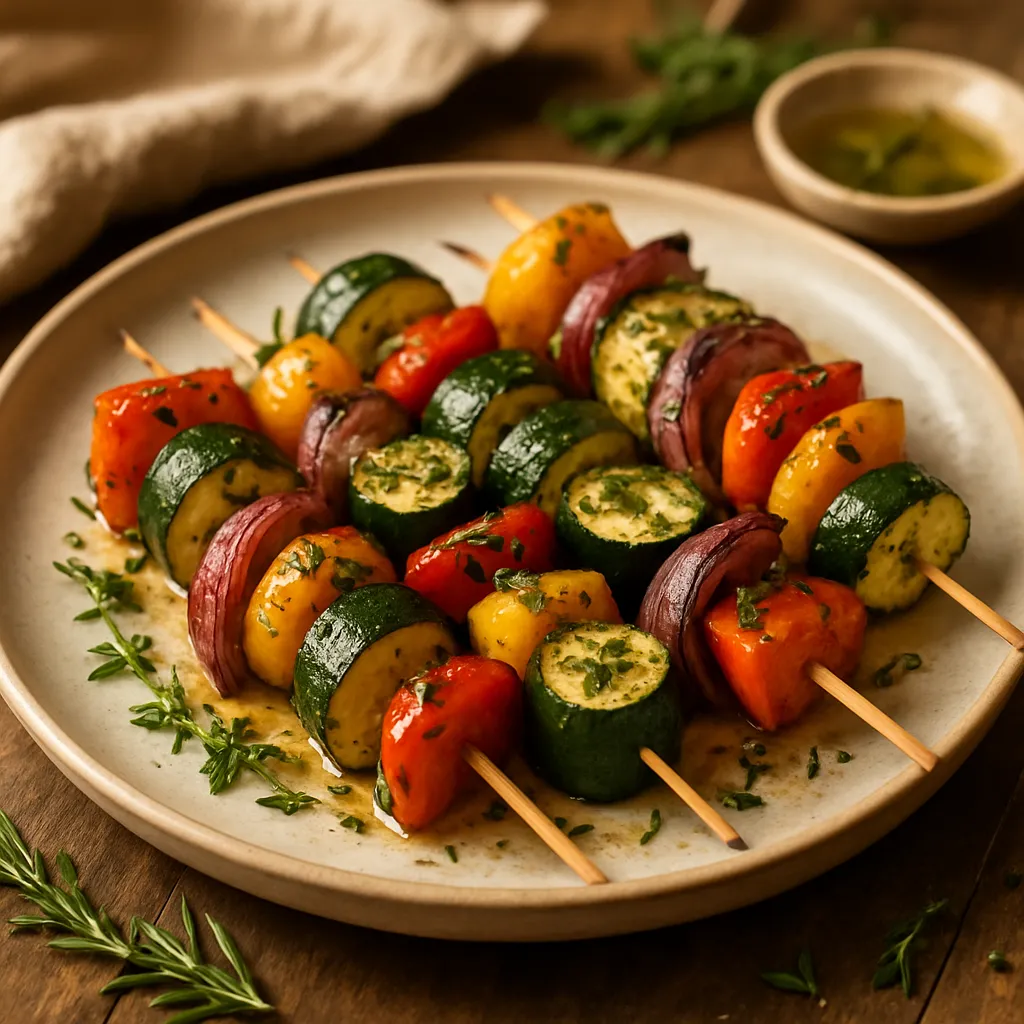 Colorful vegetable skewers marinated in herbs and grilled to enhance their natural smokiness.
