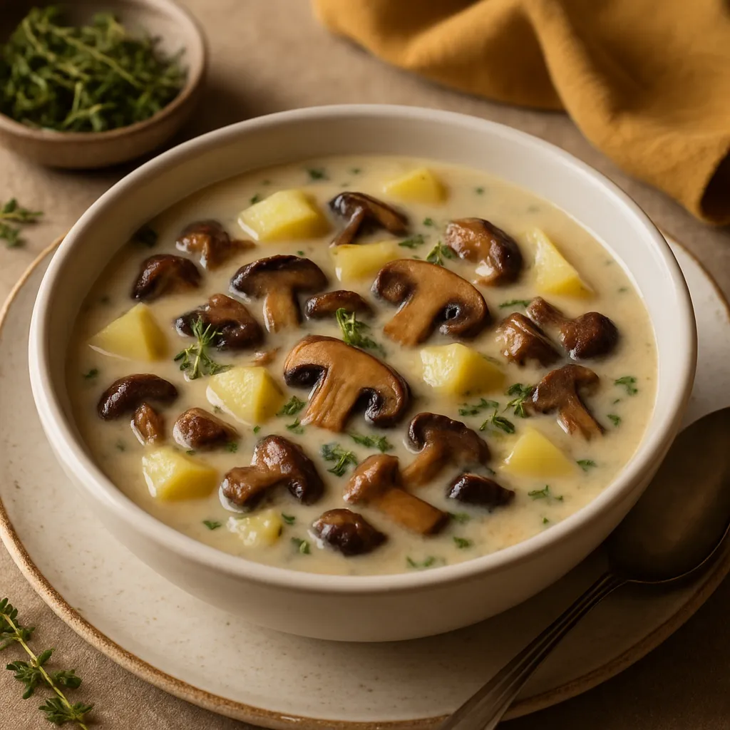 A creamy mushroom soup made with wild mushrooms and herbs, perfect for mushroom foragers.