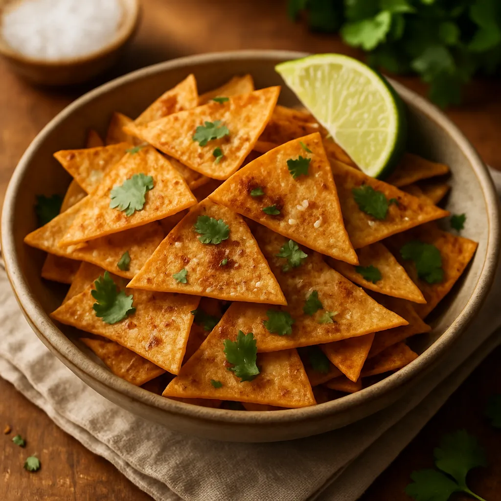 Crispy homemade corn tortilla chips, perfect for dipping or snacking, seasoned with lime and spices for a zesty flavor.