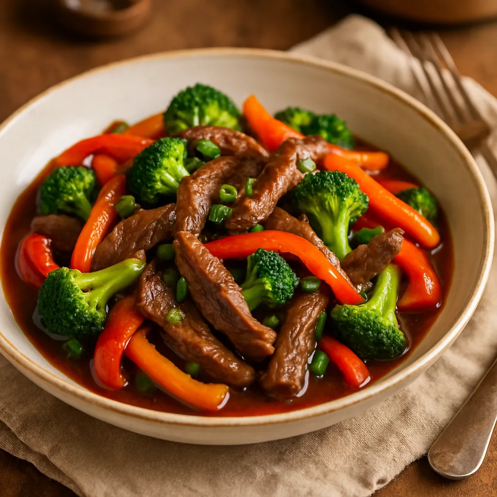 A quick stir-fry featuring tender strips of beef and seasonal vegetables, seasoned with soy sauce, perfect for a hearty lunch.
