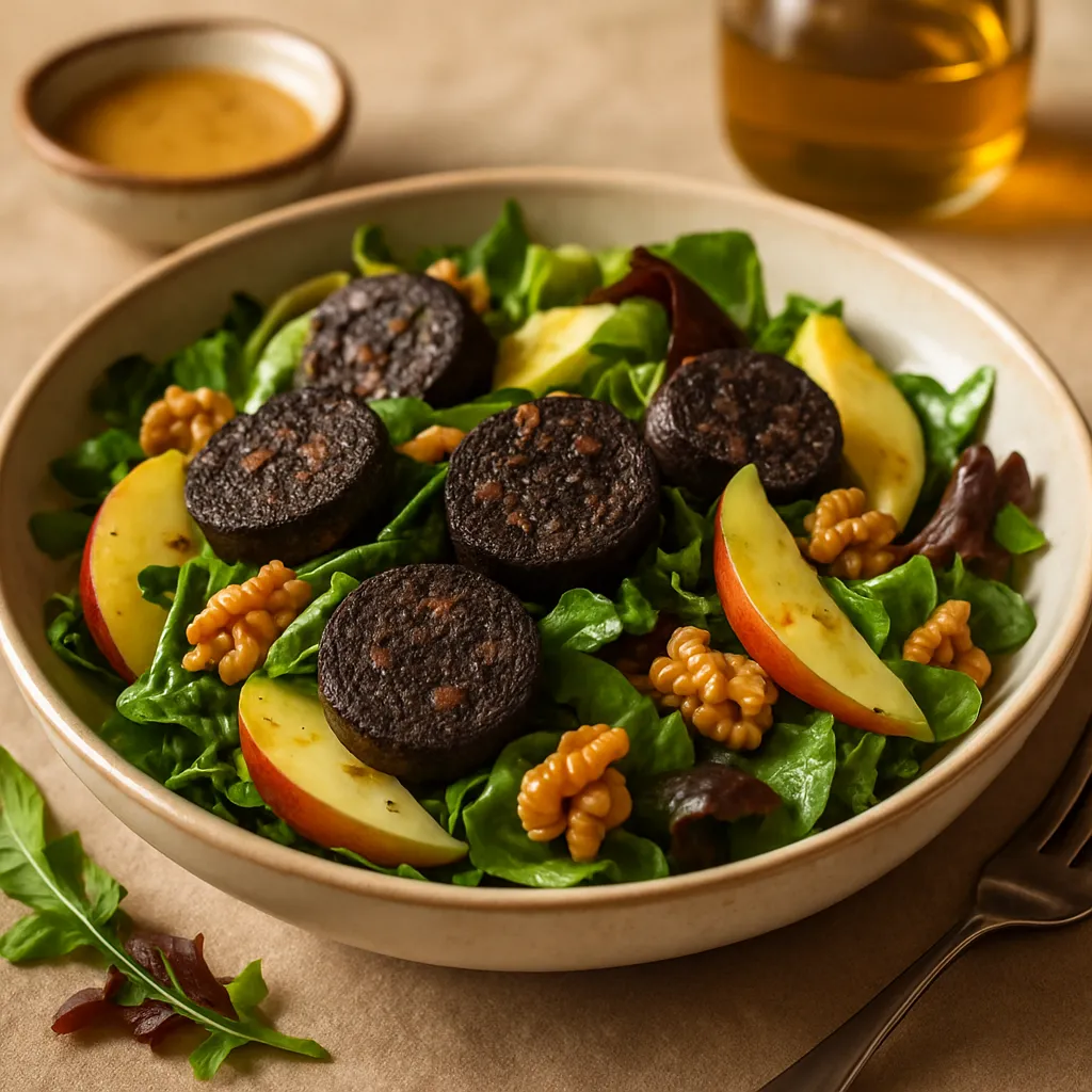A unique salad featuring slices of rich black pudding paired with sweet apple and mixed greens, topped with crunchy walnuts and a honey mustard dressing.