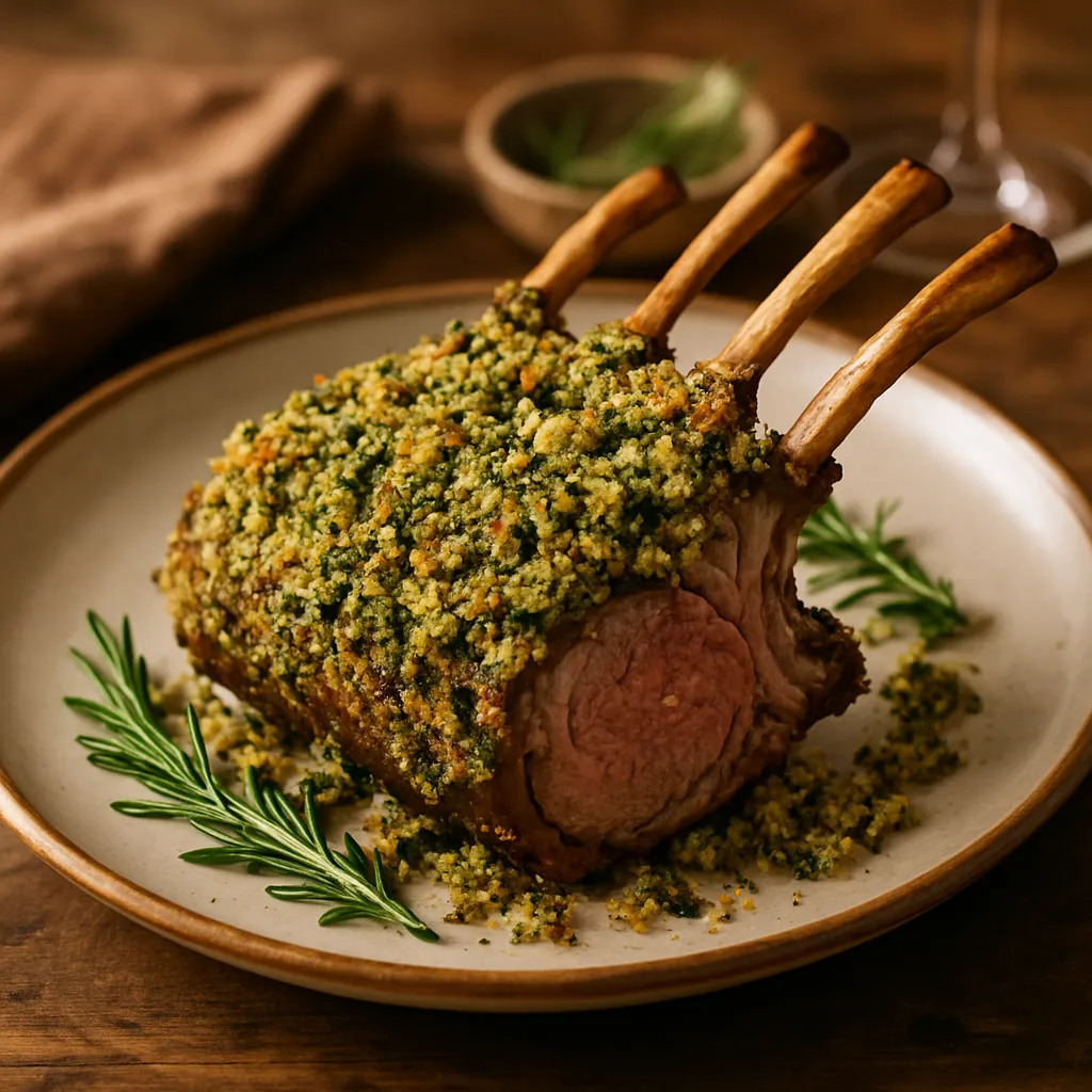 A succulent rack of lamb coated with herbs and breadcrumbs, roasted to perfection.