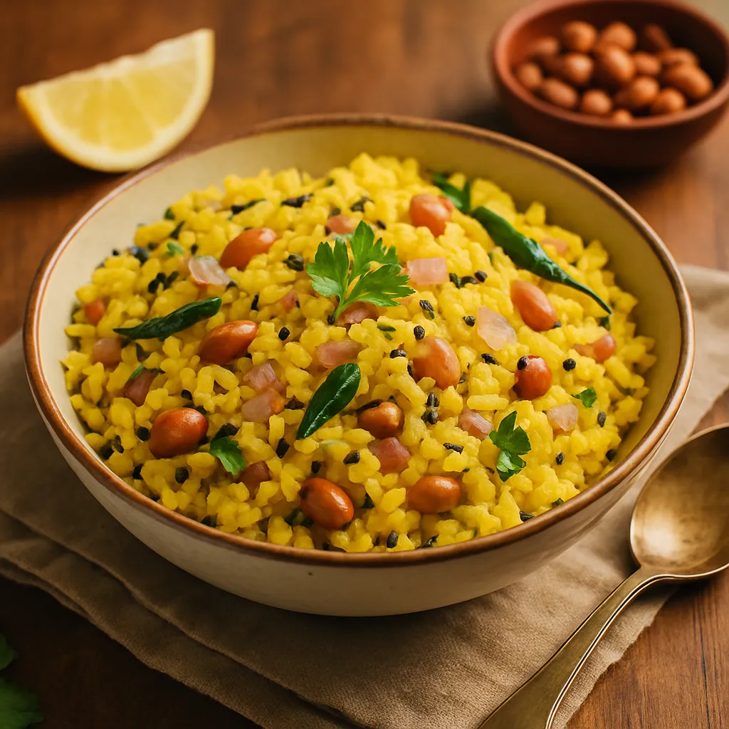 A Maharashtrian breakfast made from flattened rice, sautéed with onions, mustard seeds, and turmeric, garnished with fresh coriander and lemon.