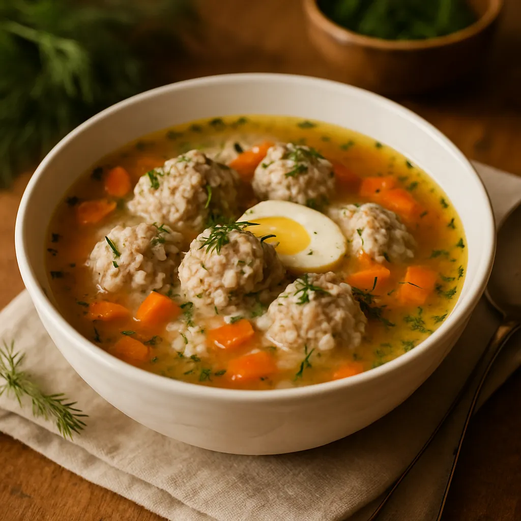 A festive Lithuanian soup featuring savory meatballs, fresh vegetables, and aromatic herbs, traditionally served at weddings.