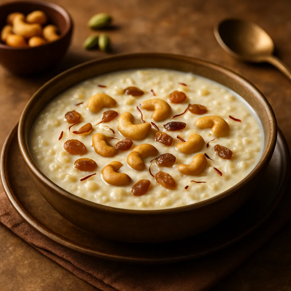 A sweet and creamy rice pudding flavored with cardamom, a beloved Indian dessert served at dinner.