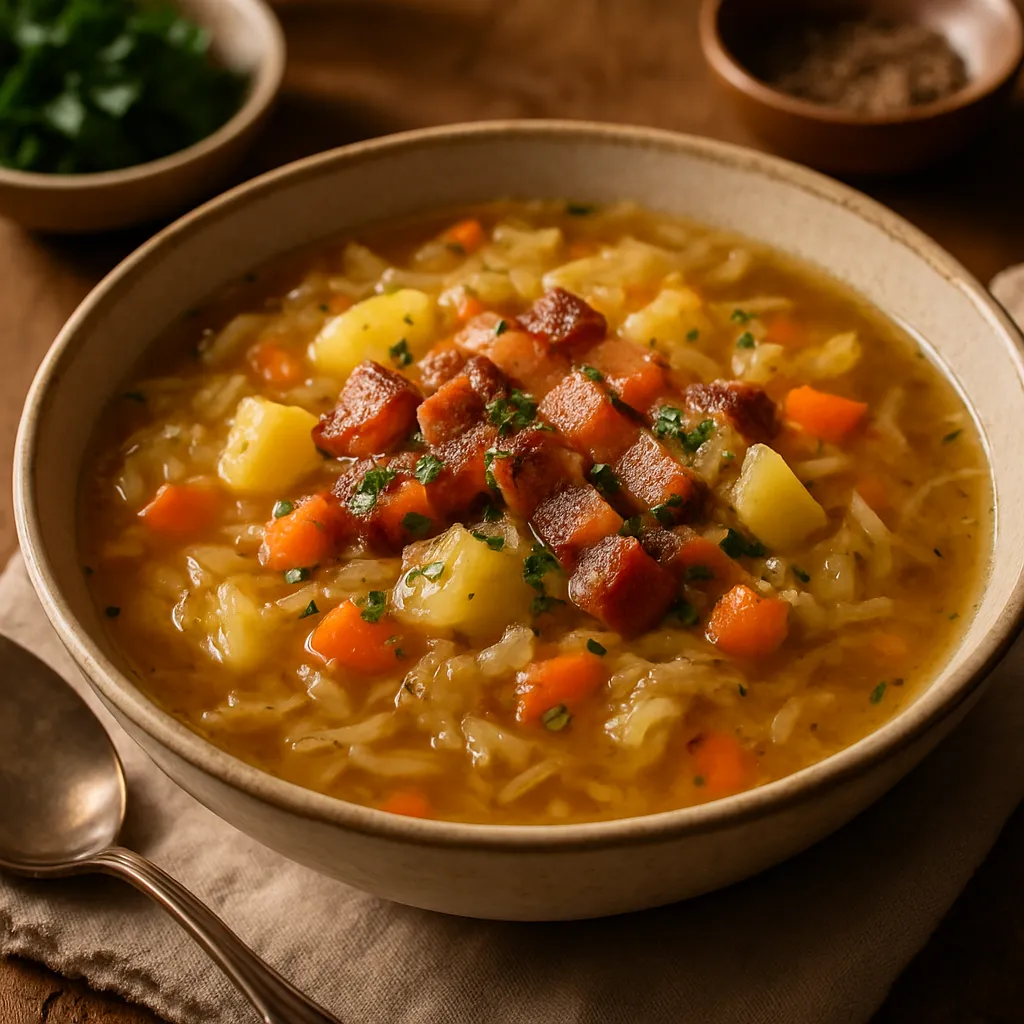 A robust soup made with fermented cabbage, potatoes, and smoked meats, embodying traditional Lithuanian flavors.