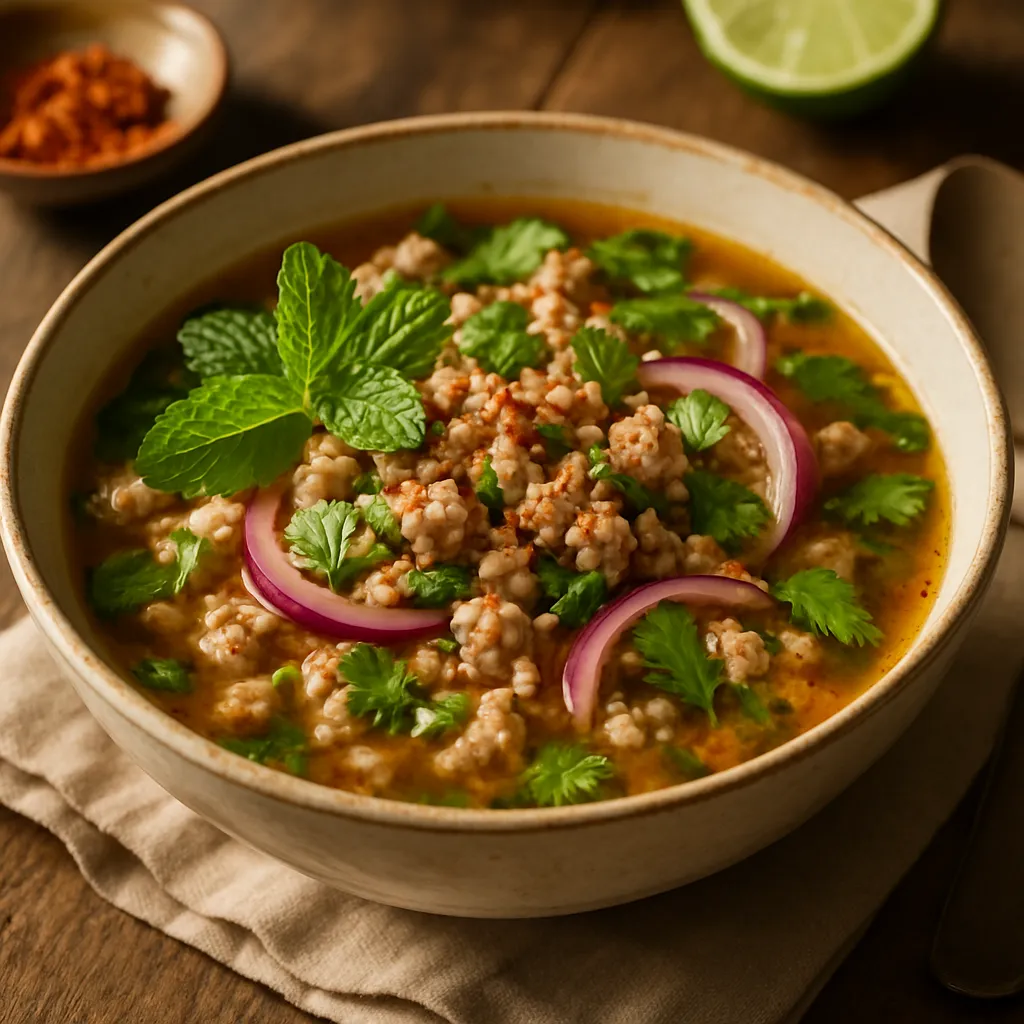 A flavorful soup made with minced pork, herbs, and spices, served with a tangy dressing.