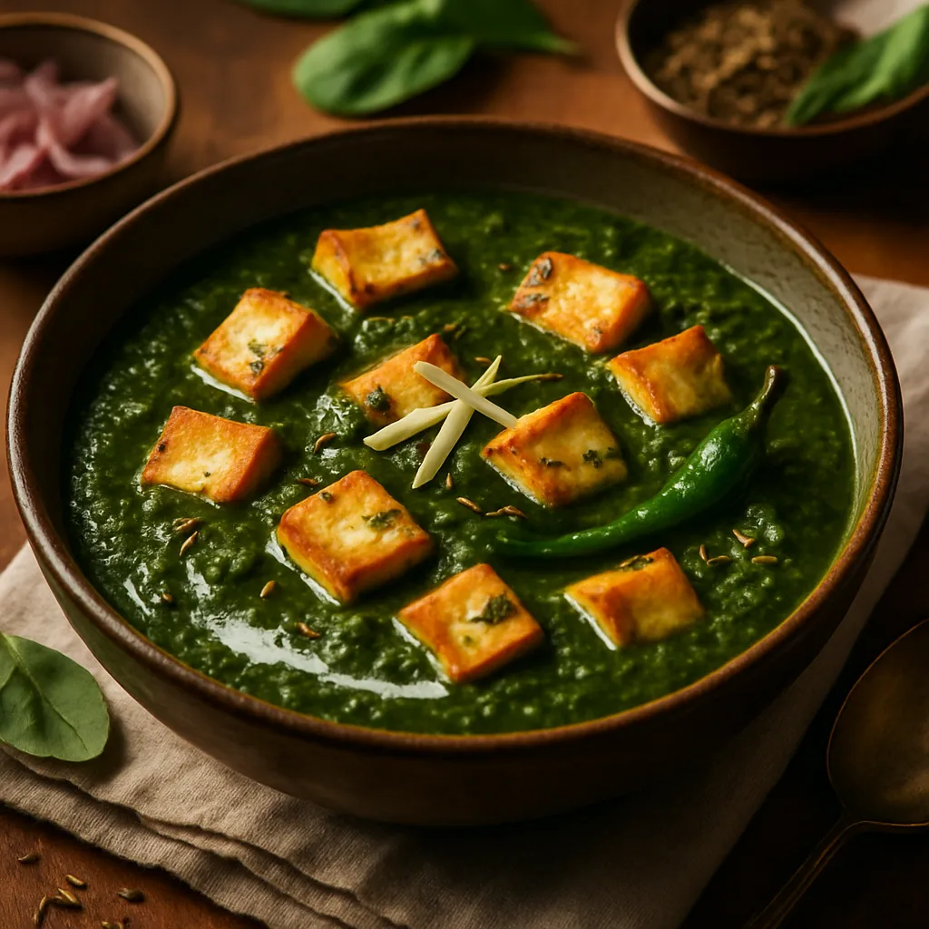 Creamy spinach curry with soft paneer cubes, a nutritious and flavorful vegetarian dish.