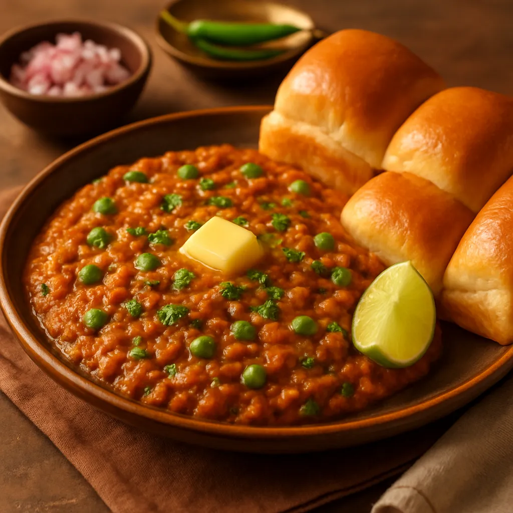 A spicy mix of mashed vegetables served with buttered bread rolls, a popular street food from Mumbai.