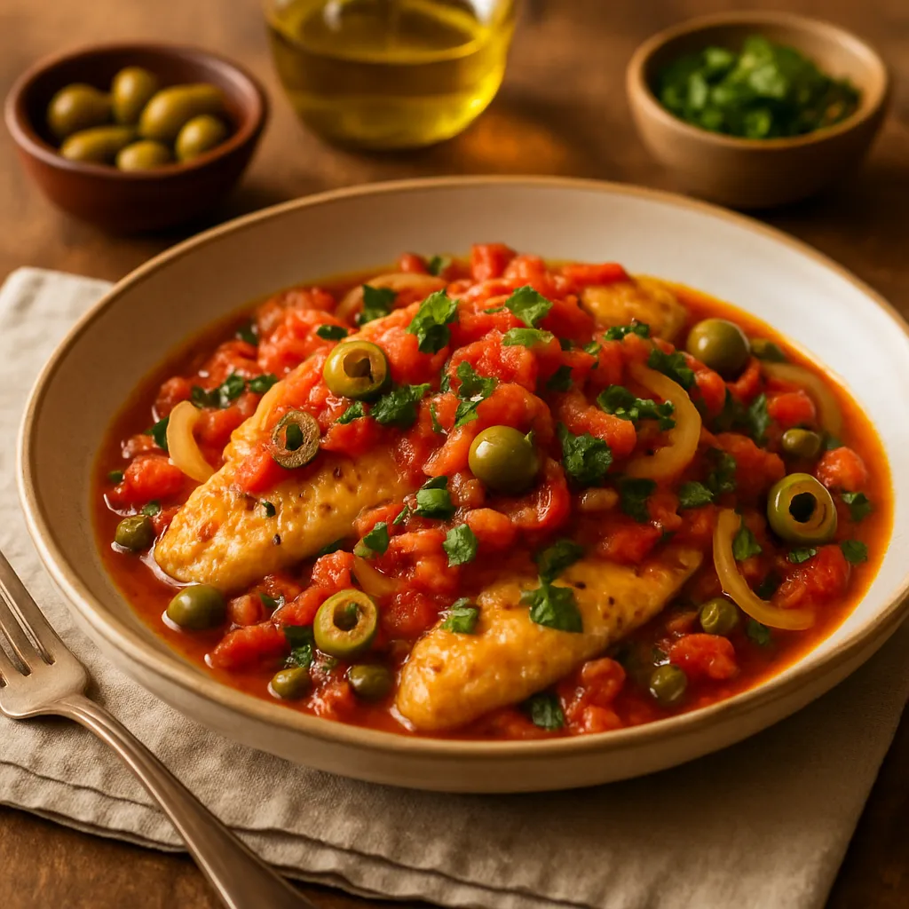 Fish fillets simmered in a tomato sauce with olives, capers, and spices, showcasing flavors from Veracruz.