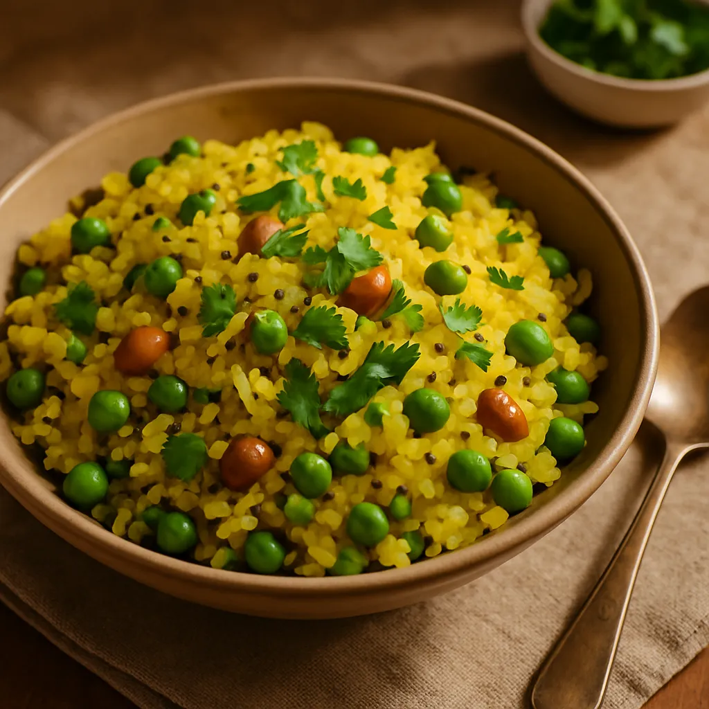 Light and fluffy flattened rice sautéed with peas, peanuts, and spices, garnished with fresh coriander.