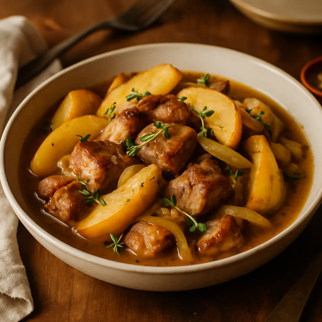 A comforting casserole combining tender pork with sweet apples and onions, perfect for family dinners.