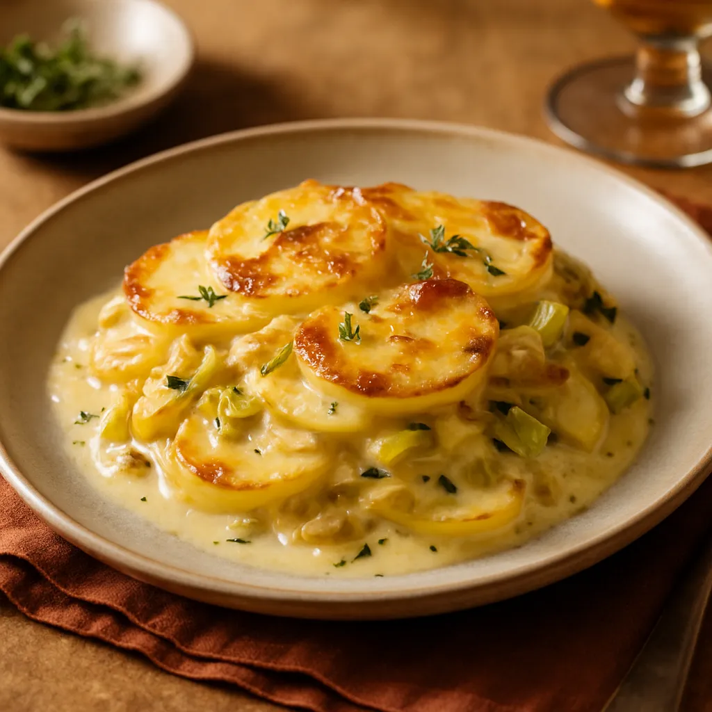 Layers of potatoes and leeks baked in cream, a decadent Irish side dish that's perfect for any meal.