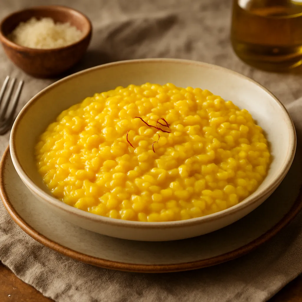Creamy risotto flavored with saffron, giving it a beautiful golden color and rich taste, typical of Milan.