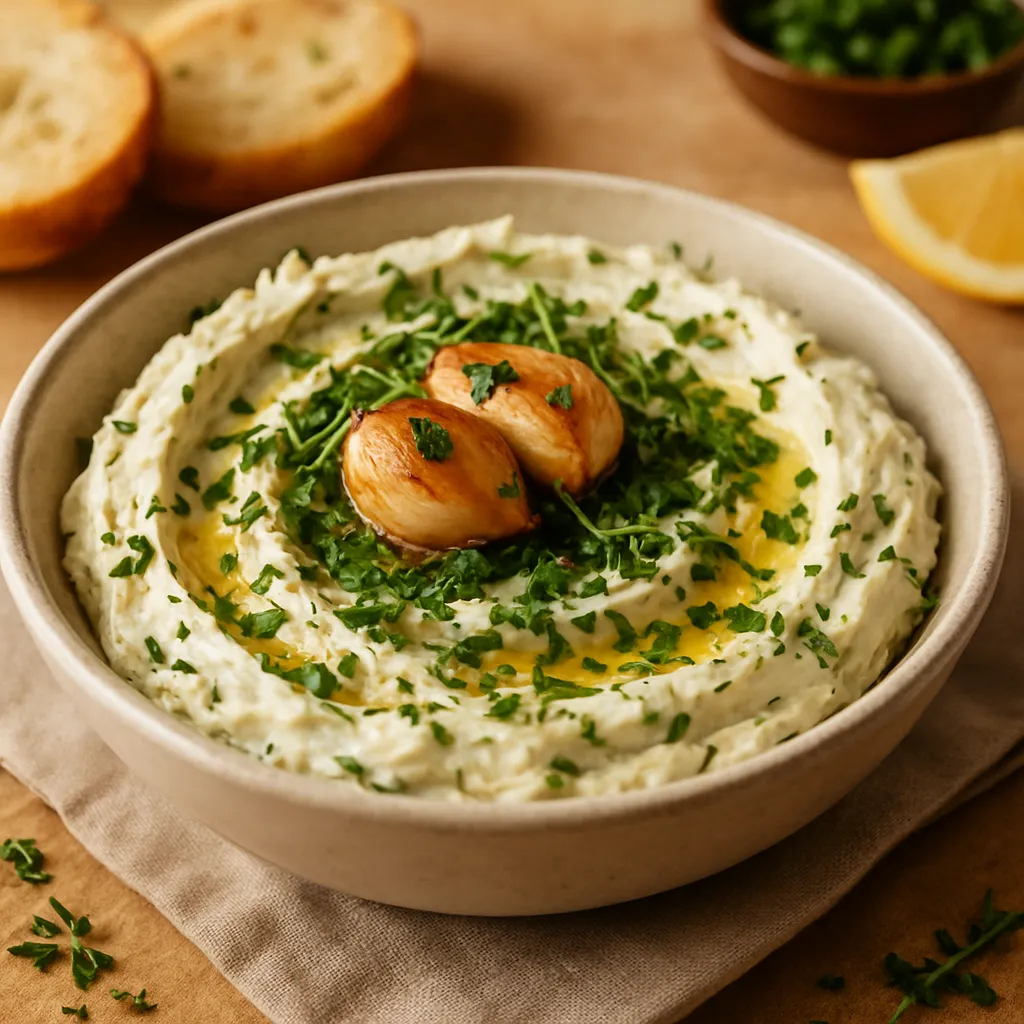 In a mixing bowl, combine the cream cheese, roasted garlic (squeezed out of the skins), chopped herbs, lemon juice, salt, and black pepper.