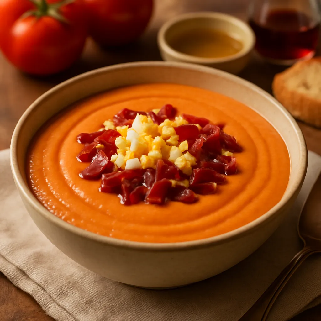 A thicker version of gazpacho, this cold tomato soup is garnished with hard-boiled eggs and jamón, perfect for a refreshing lunch.