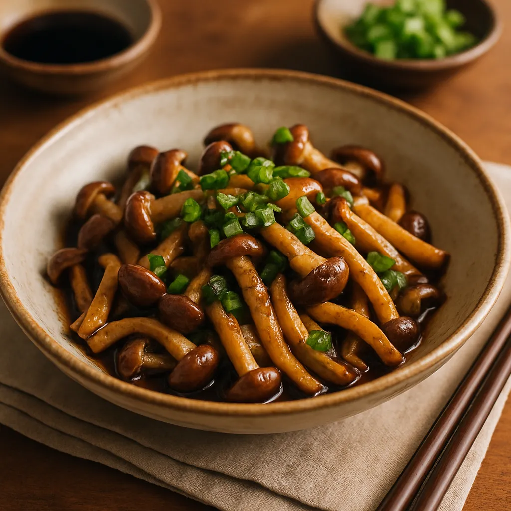 Quickly sautéed shimeji mushrooms with a touch of soy sauce and sesame oil for umami flavor.