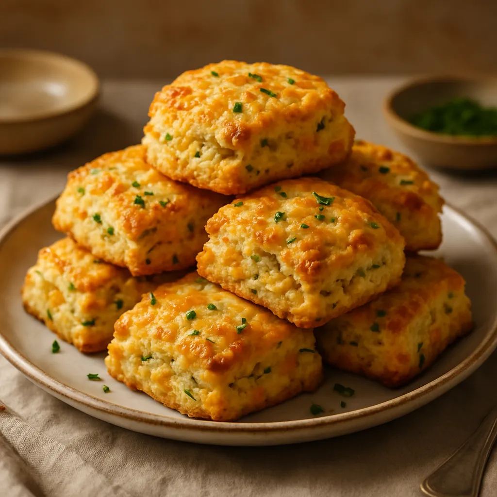 Delight in these savory cheddar and chive scones, perfect for a snack or brunch, with a rich cheesy flavor and a hint of fresh chives.