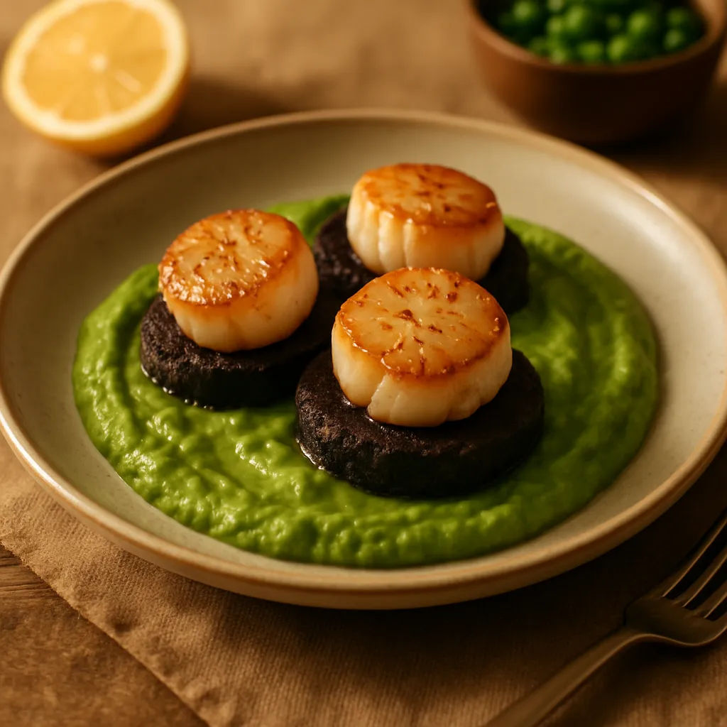 Pan-seared scallops served with crispy black pudding and a smooth pea purée, a gourmet Irish dish.