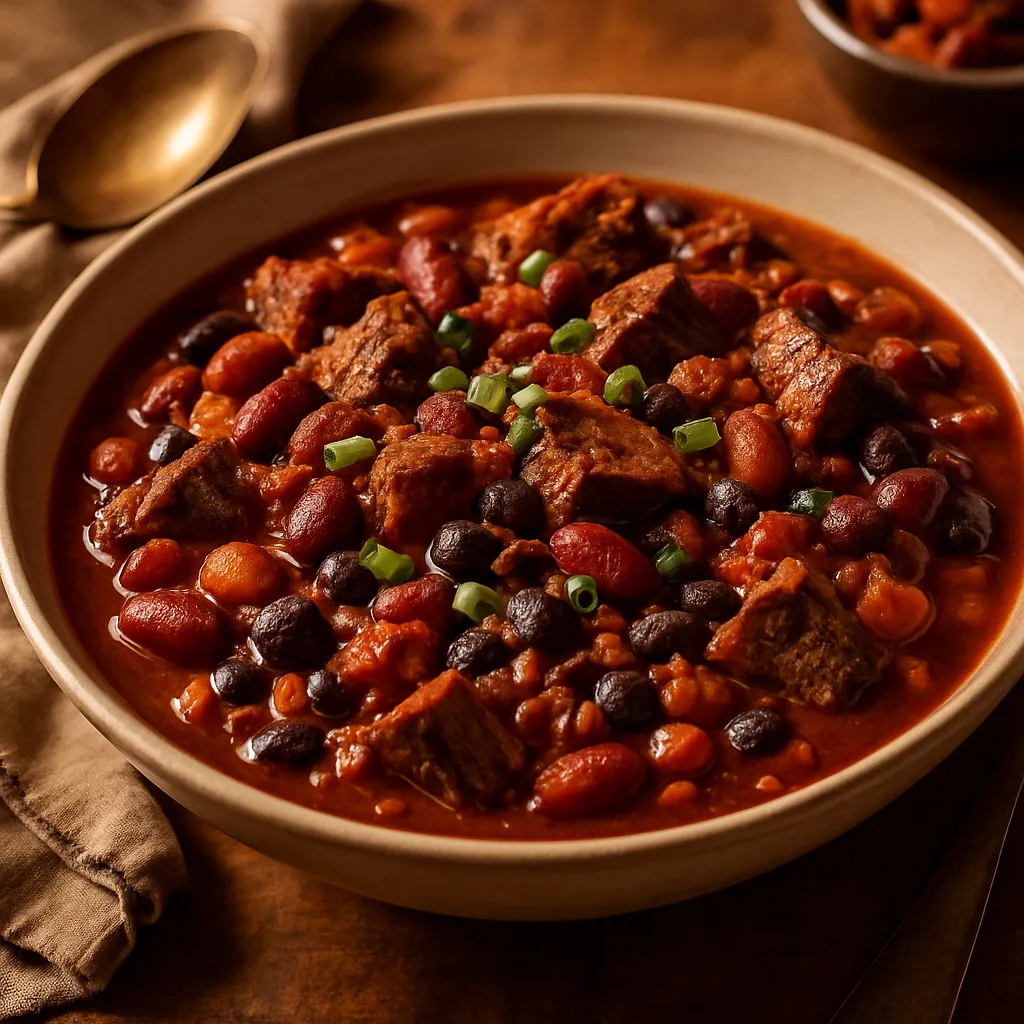 A hearty chili made with smoked brisket, beans, and spices, perfect for a filling barbecue dinner.